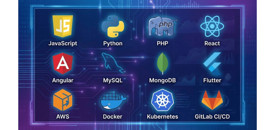 | Programming Languages | Java, Python, PHP, JavaScript (Node.js) | Core languages for backend and full-stack development, enabling scalable and efficient software solutions. |